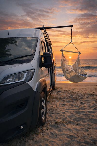Good question. Put simply, it's a telescopic hanging system that mounts to your existing roof rack/roof bars, providing the ultimate in comfy seating - right from your camper van. Watch the sunset from the hanging chair or better still, fall asleep under the stars on the hanging hammock - it's a whole new way to relax!